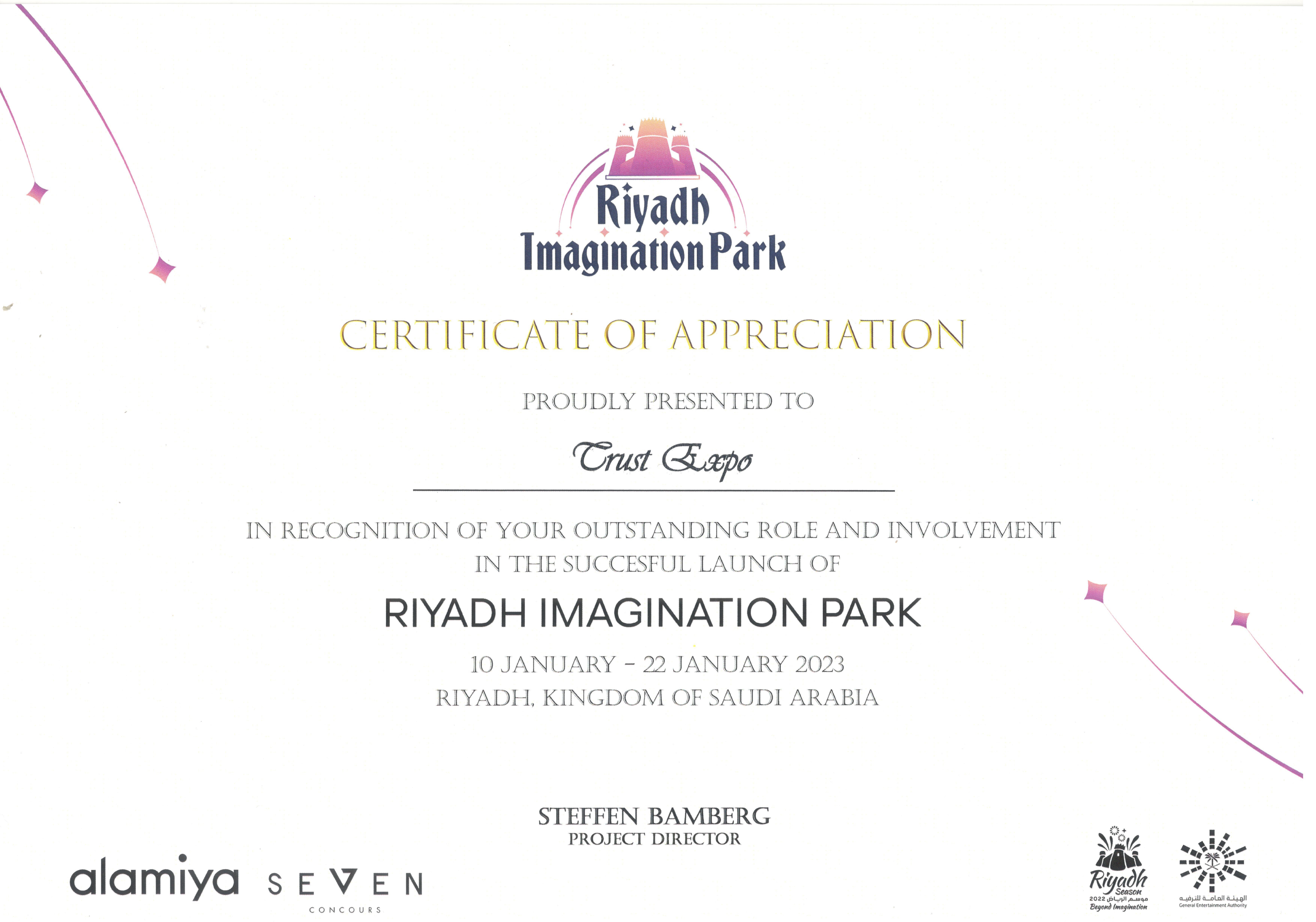 One of the most significant events we had worked on, starting from the production design to execution and following all the detailed designs as per the 3d designs confirmed by the client because of our work w, got an appreciation certificate from the client and Ministry of Entertainment for the finished work in 20 days which is a massive achievement for the amount of work executed. Designed and Produced by Alamiya.